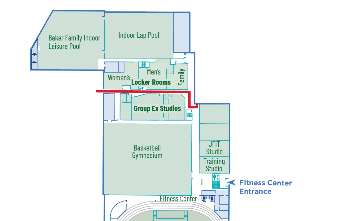 Once demolished, pieces of the machinery will be removed from the building via the hallway outside of the Group Exercise studios and locker rooms. (see map below) To ensure safety, representation from the demolition crew will momentarily pause public access to the hallway during these instances. We anticipate these interruptions will be brief. Access to the locker rooms and group ex studios will continue as usual, but we ask everyone to exercise additional caution when in the area.