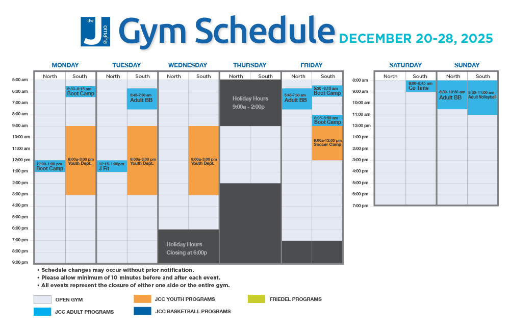 The JCC gymnasium hours change on a seasonal basis. Check back often to see the most up-to-date times for programs, practices, and open gym slots. If you have questions on gym availability or programming questions, please contact Josh Meier, Director of Athletics, at 402.590.2143, or contact Member Services at 402.334.6426.